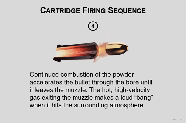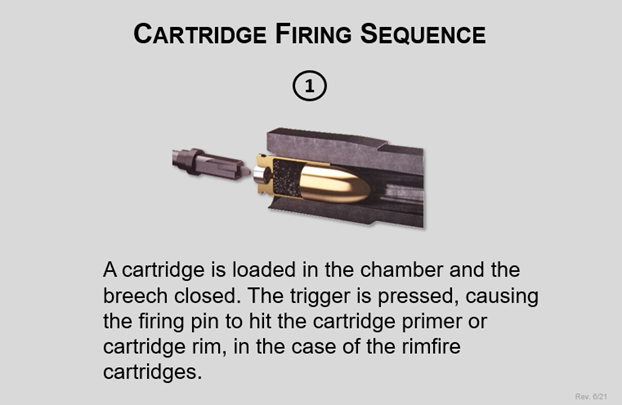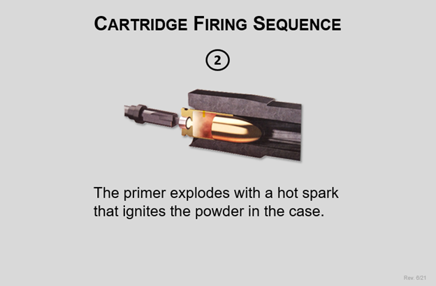 The firing pin strikes the primer or case rim and ignites the priming compound.