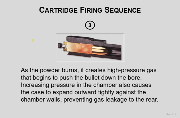 The high-pressure gas propels the bullet out of the barrel at a high velocity.